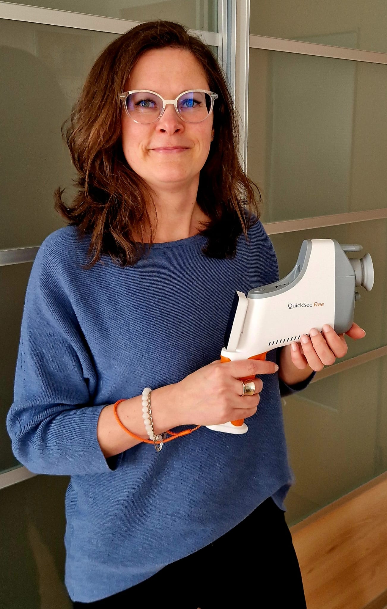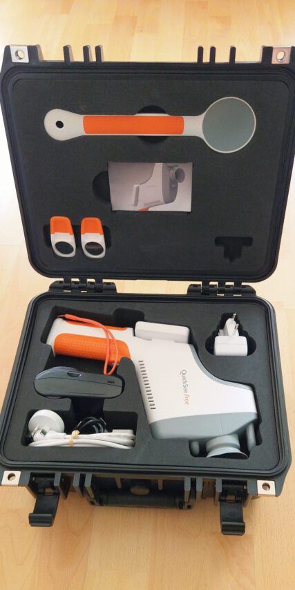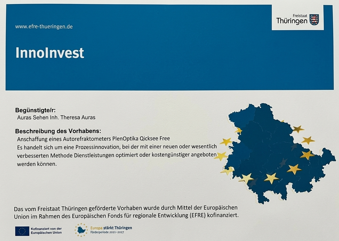 Seit neuestem habe ich mir dank des Förderprogramms „InnoInvest“ der Thüringer Aufbaubank ein neues hilfreiches Messgerät anschaffen können. Das QuickSee Free von PlenOptika ist ein tragbares Gerät zur schnellen und präzisen Bestimmung der Sehstärke. Er bietet die Genauigkeit großer Geräte, ist aber handlich und kabellos. Die Messung dauert nur wenige Sekunden und funktioniert ohne Augentropfen.